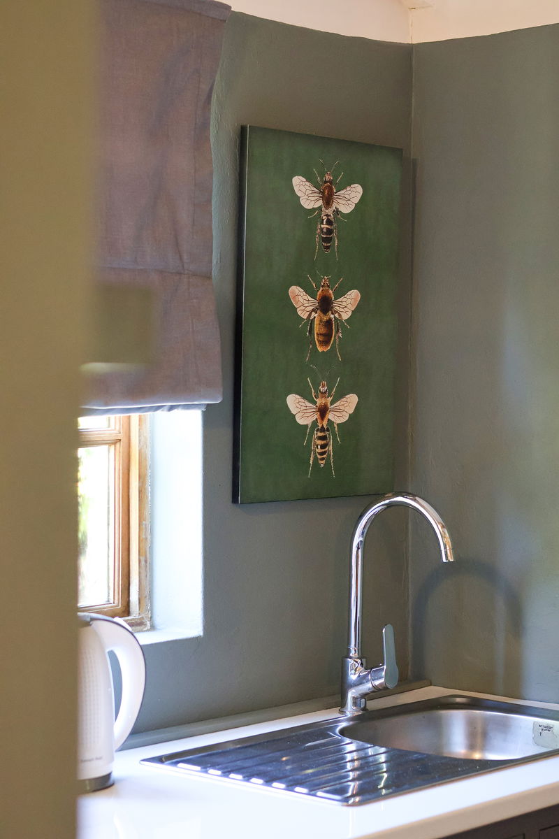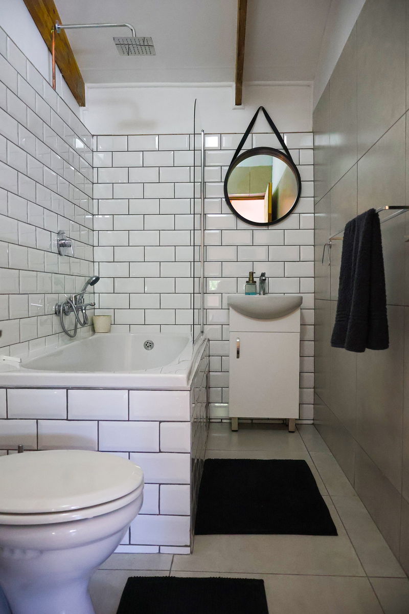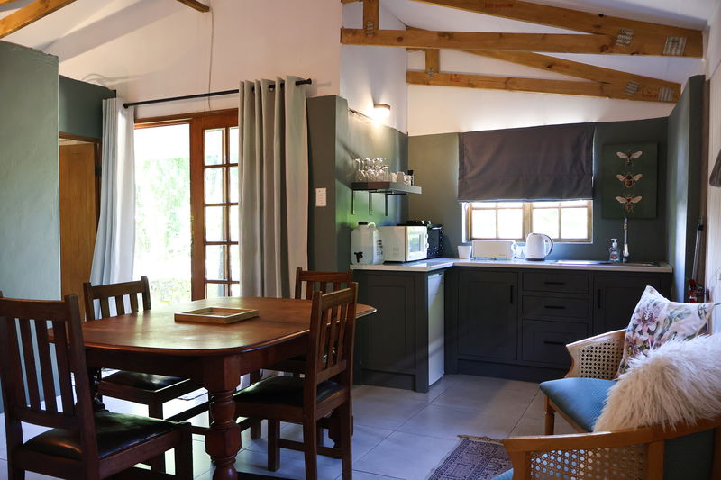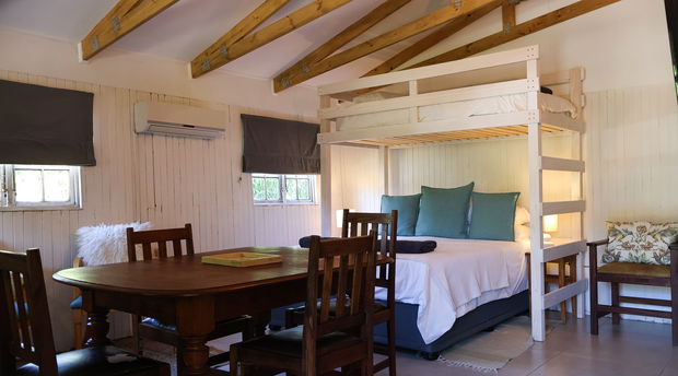 Cabin with a large living area that has a dining table, seating, double bed and loft-bed. Adjacent room with double bed. Neat kitchenette with everything you need to cater for all meals. Bath with wall mounted shower fixture. Private braai area with seating.